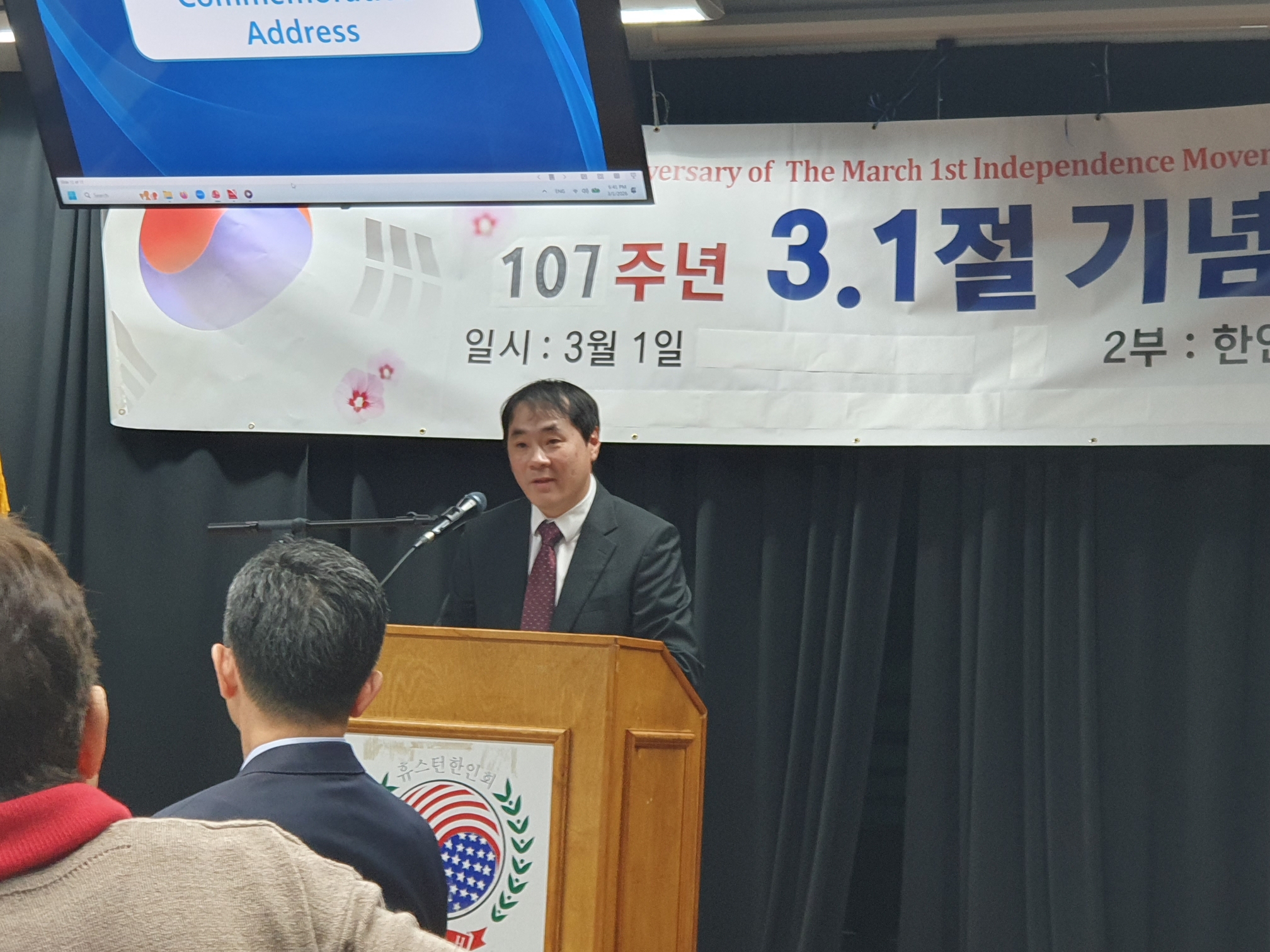 최인택 부총영사는 휴스턴 한인회관에서 열린 제107회 3.1절 기념식에 참석하여 대통령 기념사를 대독하고